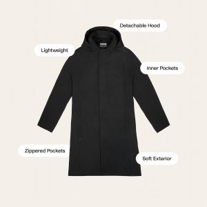 A modern trench with waterproof comfort.This is a long rain jacket with clean and crisp tailored details featuring unexpectedly soft lightweight and breathable vegan materials. Made with Dyma-tex® 100% waterproof technology this versatile coat easily transitions from basic commute to night on the town.